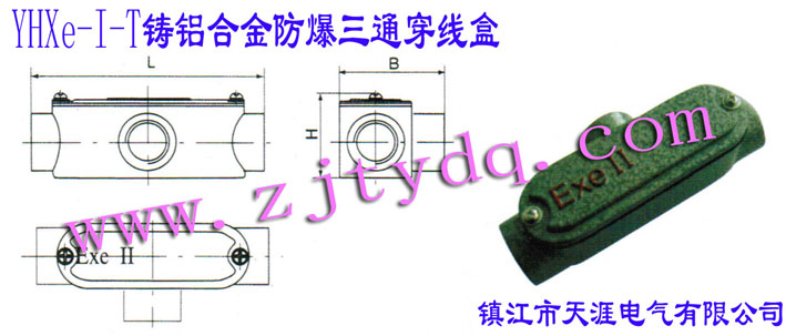 防爆電器 >> 防爆穿線盒 >> YHXe-I-T鑄鋁合金防爆三通穿線盒 AL-alloy Anti-explosion Pull Box of Tee Type 說明: 1、適用范圍: 爆炸性氣體混合物危險場所:1區(qū)、2區(qū) Danger places with gas mixture:Zone 1&2 爆炸性氣體混合物:IIA、IIB、IIC Explosive gas mixture: IIA、IIB、IIC 溫度組別:T1-T6 Temperature group:T1-T6 戶內(nèi)、戶外 indoor,outdoor 2、產(chǎn)品特點: 外殼采用鑄鋁合金,表面噴塑 The closure is made of Cast Aluminum alloy with the surface painting 如需要變徑時可特制 It can be fabricated according to the special requirements 防爆標(biāo)志:ExeII Explosion-proof Mark:Exe II 防爆等級:IP55 Protection Grad:IP55 結(jié)構(gòu)形式多樣,便于安裝 Many kinds of structures are convenient for installation 3、YHXe防爆穿線盒根據(jù)客戶的要求,在不同的使用場所可選擇一下三種型號:There are three specifications for different purposes 1)、YHXe-I鑄鋁合金防爆穿線盒 YHXe-I Explosion-proof Box of Cast Aluminum Alloy 2)、YHXe-II鑄鐵防爆穿線盒 YHXe-II Explosion-proof Box of Cast Iron Alloy 3)、YHXe-III鑄鋼防爆穿線盒 YHXe-III Explosion-proof Box of Cast Steel Alloy